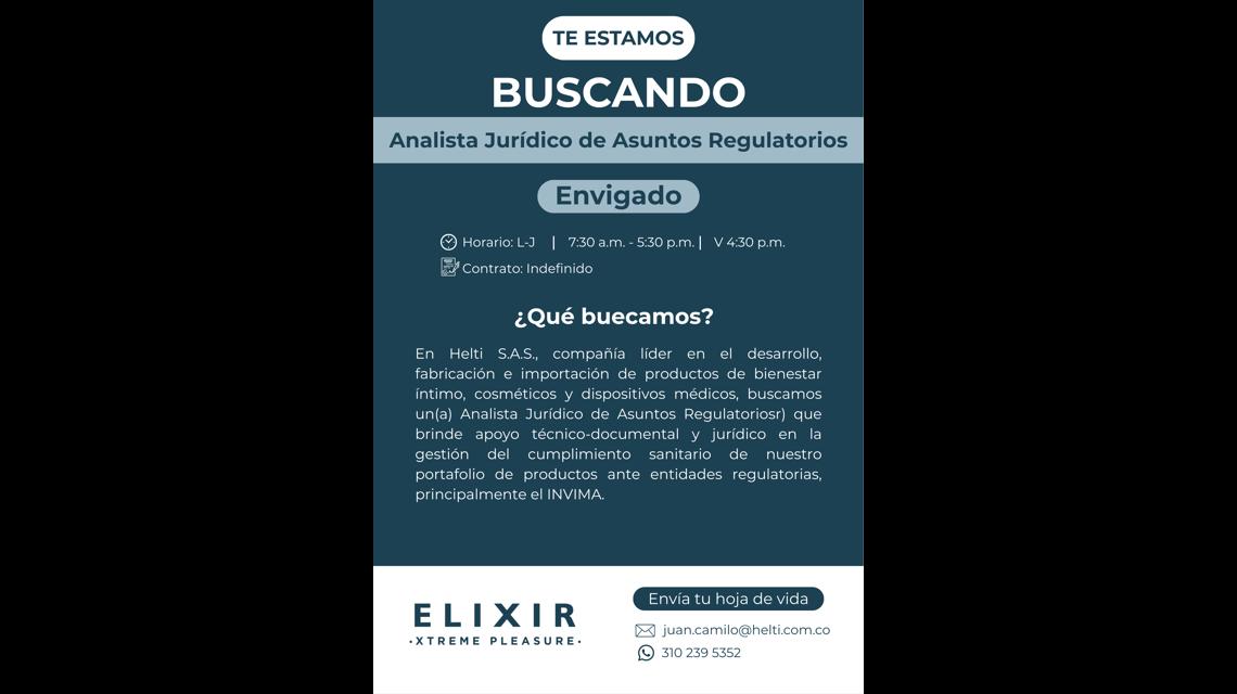 En HELTI S.A.S., compañía líder en el desarrollo, fabricación e importación de productos de bienestar íntimo, cosméticos y dispositivos médicos, buscamos un(a) Analista Jurídico de Asuntos Regulatorios Internacionales que garantice el cumplimiento sanitario y normativo del portafolio a nivel nacional e internacional.